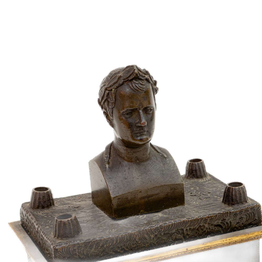 corpo rettangolare a sarcofago con figure mulieri e tritoni a bassorilievo, coperchio con busto dell'imperatore Napoleone. All'interno due vasche porta inchiostro ed una porta polvere tonde ed una vasca rettangolare porta pennini.