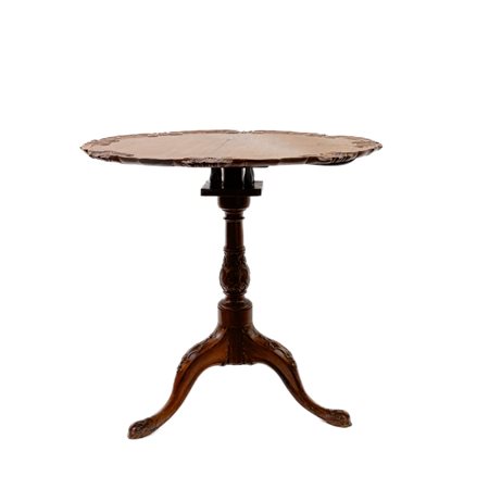 in legno di teak, piano tondo con motivi floreali, corpo a fuso desinente a tre gambe. Parti incise e scolpite a motivi floreali. Manifattura portoghese.