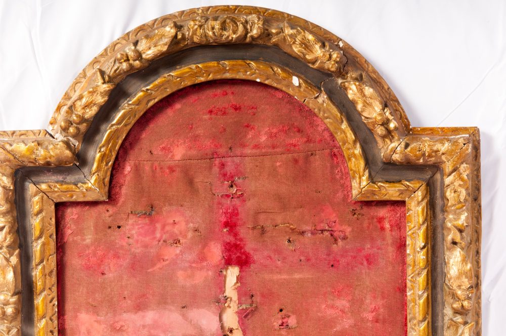 di forma rettangolare con arco a tutto sesto. A tre ordini di intaglio con decoro floreale e foglie