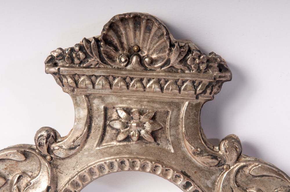 ad assetto ovale in legno e lamina di rame argentata. Di fine forma a cuore con decori a rilievo ed incisi a forma di racemi, foglie, fiori e conchiglie.