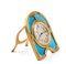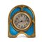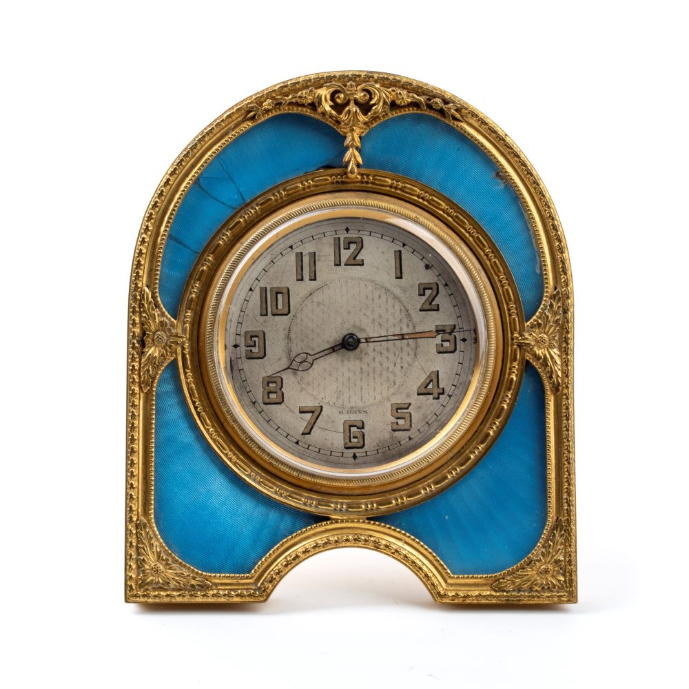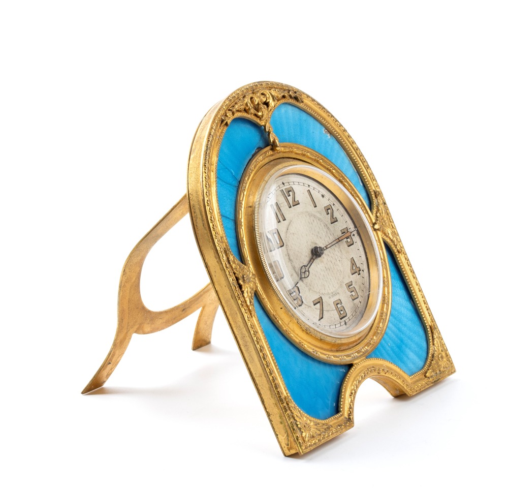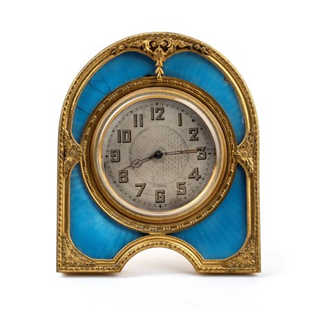 Cassa sagomata in metallo dorato con smalti guilloché nei toni del blu, quadrante argenté con numeri arabi e sfere luminescenti.Sul retro della cassa "France".