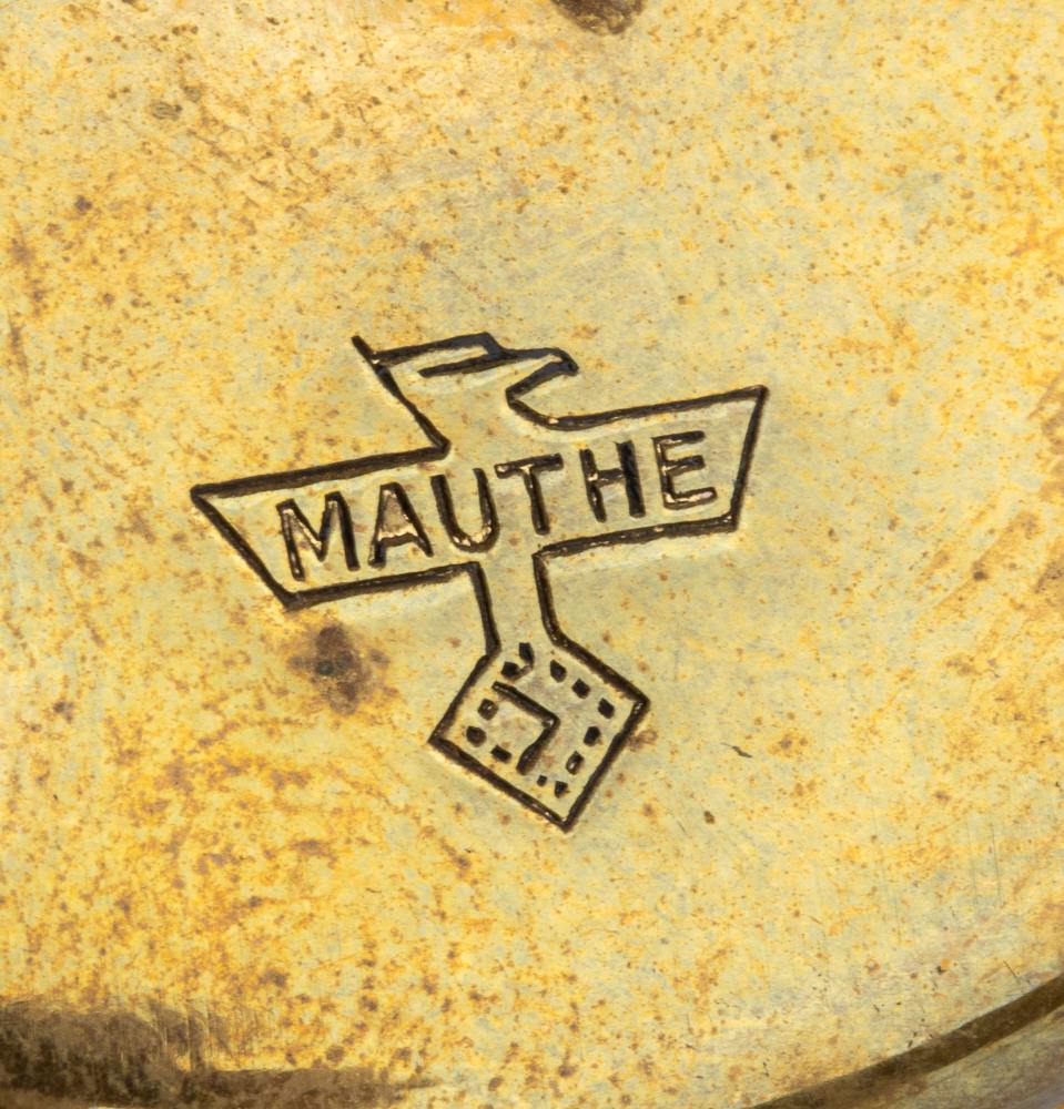 Cassa in metallo dorato e smalti guilloché nei toni del rosa e del blu, quadrante dorato con numeri arabi e sfere nere. Nella parte posteriore della cassa l'iscrizione "Mauthe".