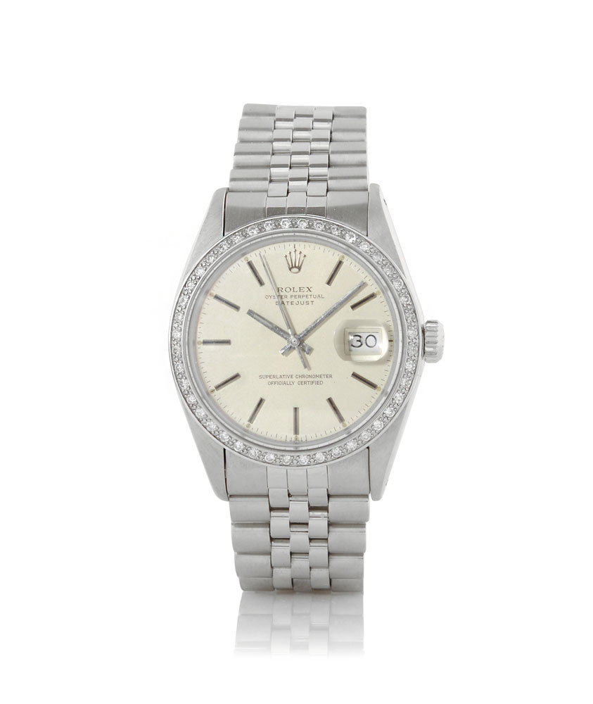 Cassa n. 9046075 in acciaio con fondello e corona a vite, lunetta in brillanti (non originale). Quadrante argentato con indici applicati, secondi al centro e data al 3. Movimento a carica automatica. Bracciale Jubilè in acciaio. Quadrante, cassa, movimento e bracciale firmati. Completo di astuccio originale.