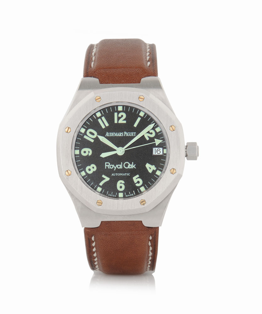 C. stainless steel, screwed crown, octagonal platinum bezel and case back secured by screws. D. black with luminous indexes, Arabic numerals and hands. M. self-winding. Dial, case and movement signed. Accompanied by Audemars Piguet box.