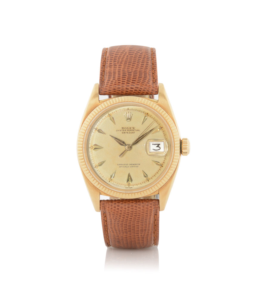 C. 18K yellow gold with screwed case back and crown, reeded bezel. D. silvered with applied indexes, centre seconds and date at 3. M. self-winding. Dial, case and movement signed. Accompanied by Rolex 18K yellow gold buckle.