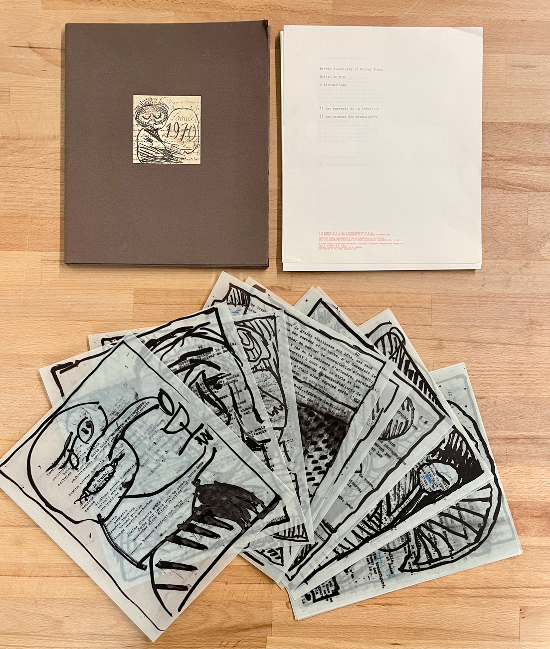 Edizione d’arte contenente 12 riproduzioni di disegni di Pierre Alechinsky su 12 dattiloscritti di Michel Butor e 12 poesie di Michel Butor per 12 disegni di Pierre Alechinsky (Agenda Olivetti 1970)