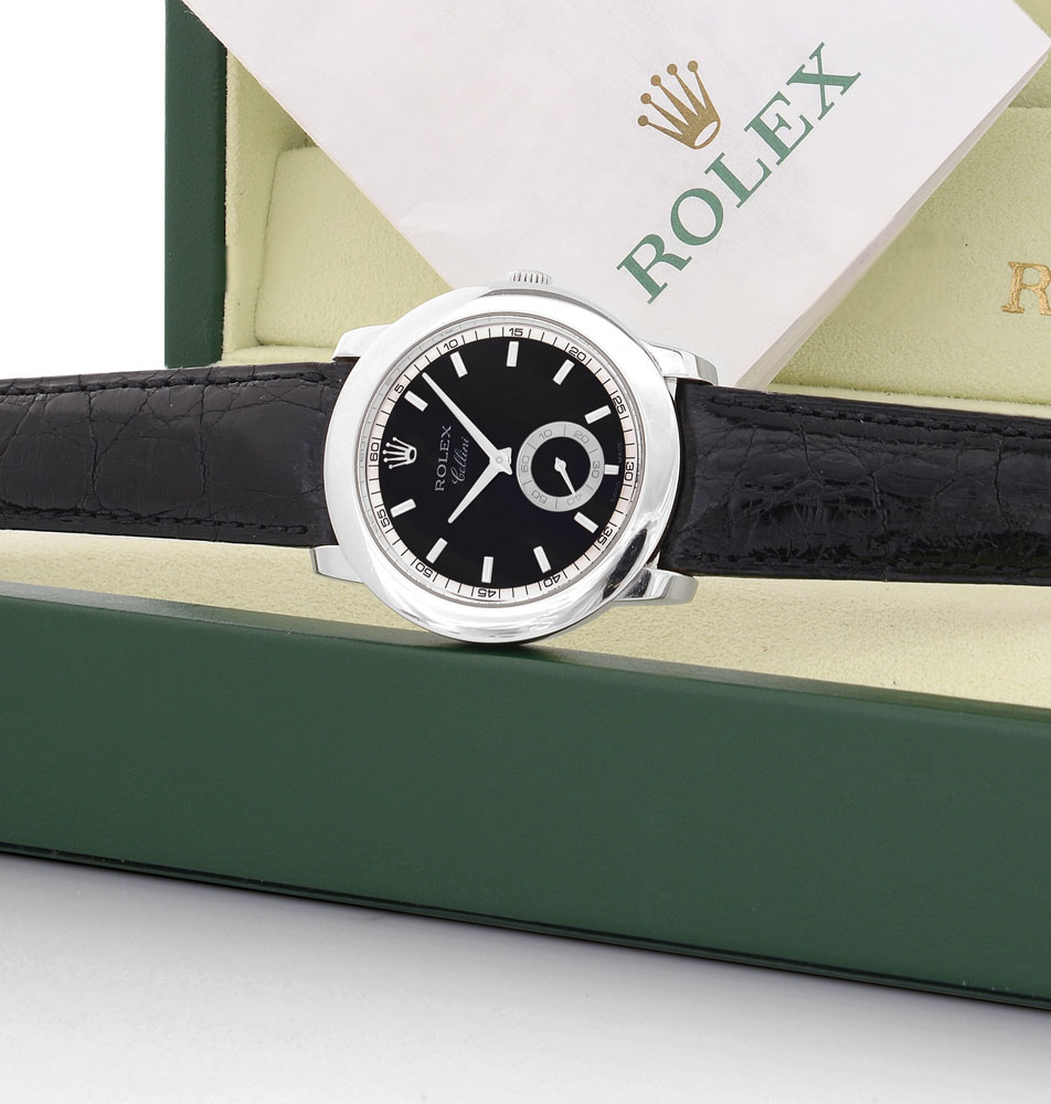 C. solid, platinum, large bezel and sapphire crystal. D. bicolor black and silvered with applied indexes, subsidiary seconds. M. manual winding. Dial, case and movement signed. Accompanied by Rolex platinum, box and certificate dated 05/2007.
