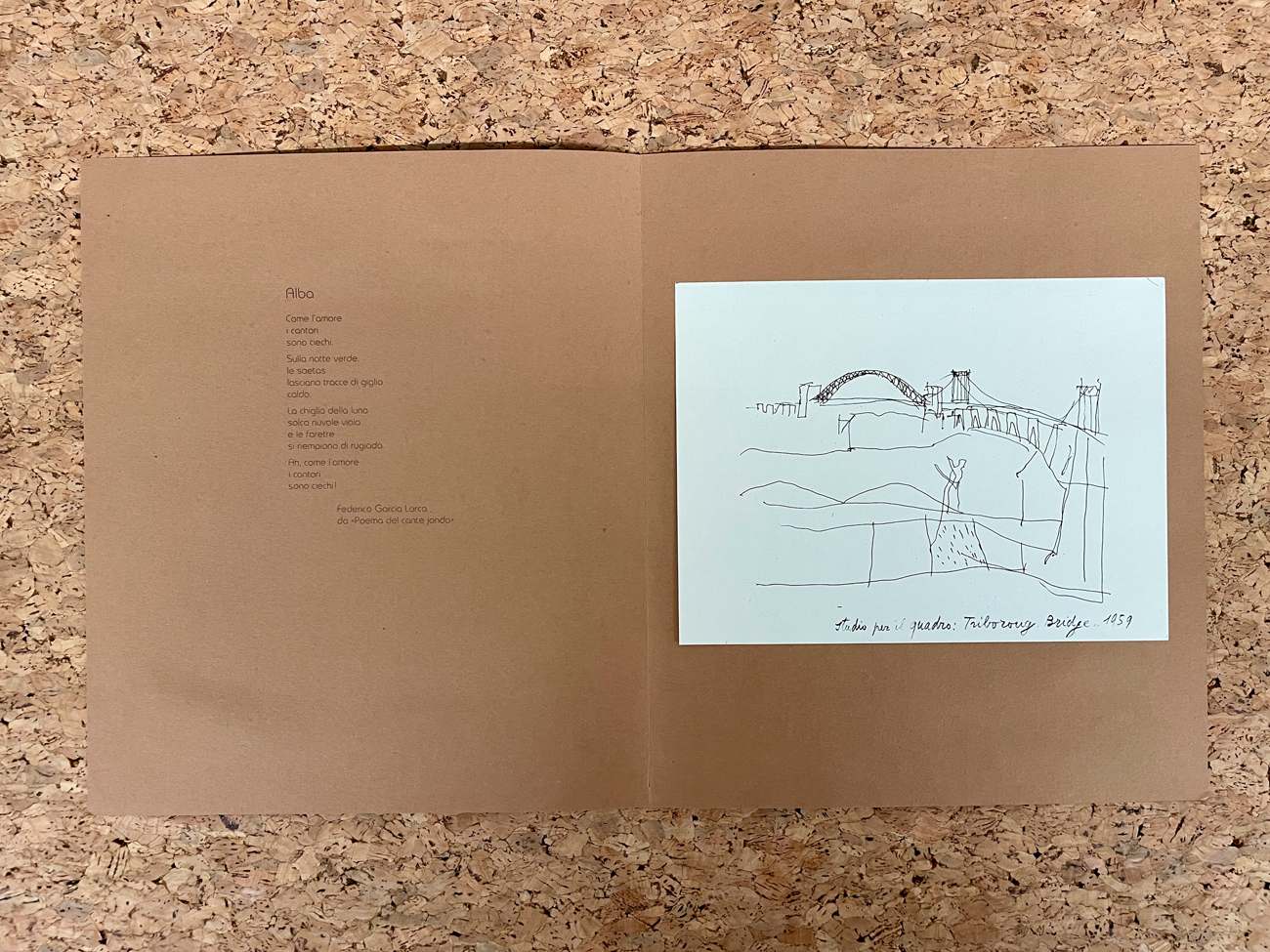 Edizione d'arte contenente testi di Sergio Grandini e Luciana Gentilini e 24 riproduzioni di disegni e tecniche miste di Franco Gentilini aventi per soggetto celebri ponti, prevalentemente americani