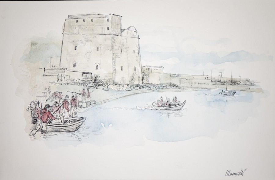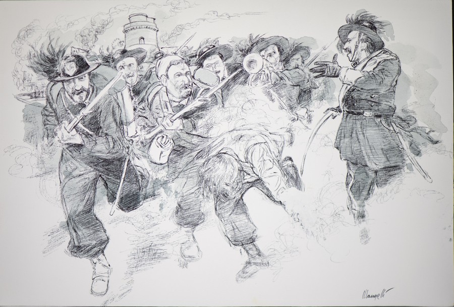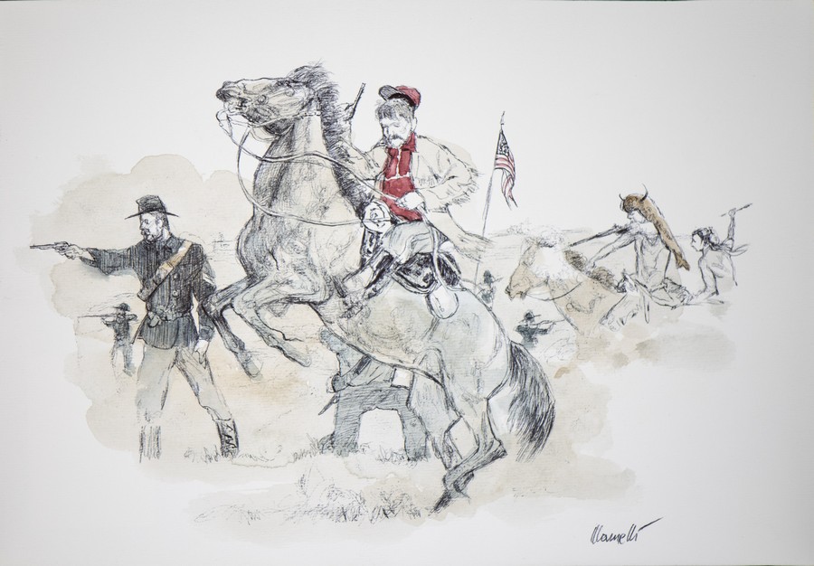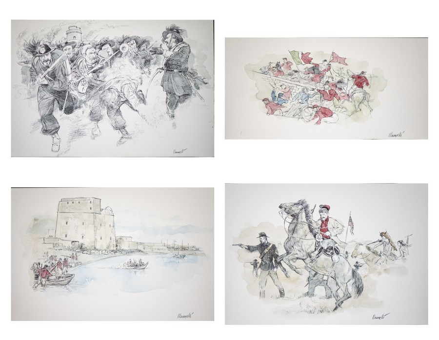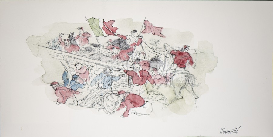 MANNELLI RICCARDO Una serie di quattro tavole sul Risorgimento italiano legate ad un racconto dello scrittore Paolo Rumiz per la Repubblica. tecnica mista su cartoncino. Cm 31,00 x 21,00. 2) 13 x 25 cm