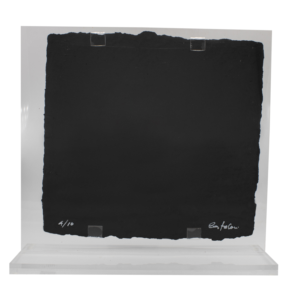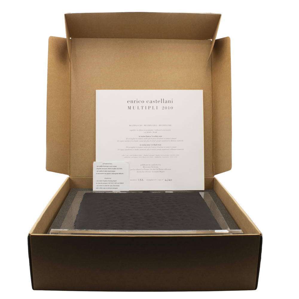 "Multiplo tre", 2010, superficie in rilievo su jesmonite in resina nera, es. 4/10, firmato e numerato sul retro, entro cornice in perspex, 34x36x10 cm.,