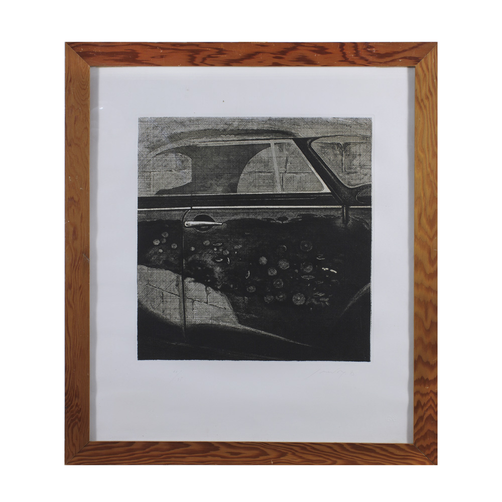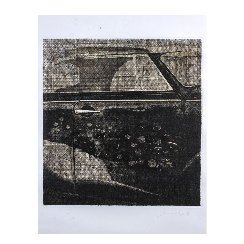 "I Fiori, la macchina e il muro", 1973, acquaforte e acquatinta, es. 40/45, firmata e datata in basso a destra, entro cornice