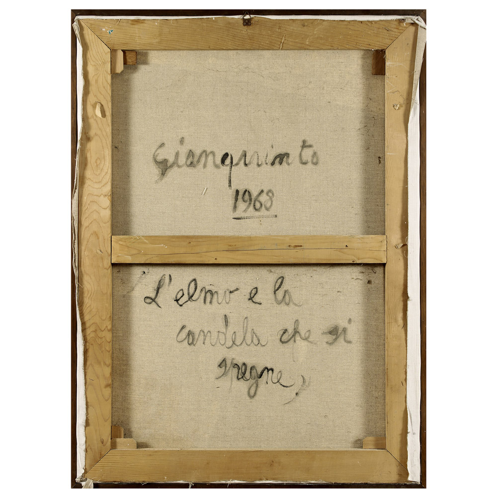 "L'elmo e la candela che si spegne", 1968, tecnica mista su tela, firmata e datata in basso al centro, firmata, datata e titolata sul retro, entro cornice