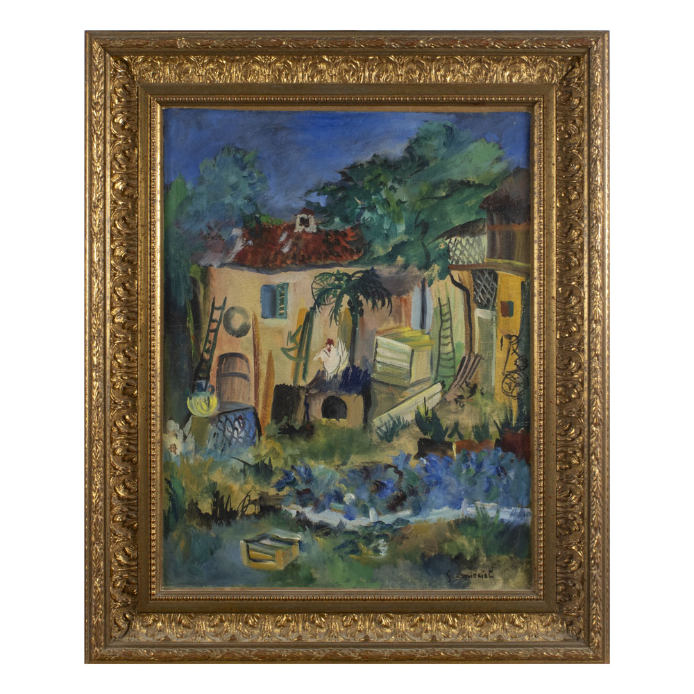 "La fattoria", anni 60 circa, olio su tela, firmato in basso a destra, entro cornice
