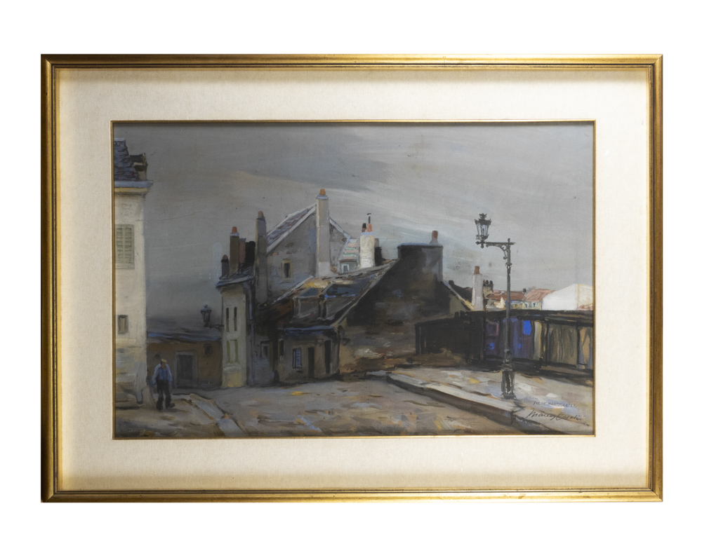 "Vecchia Montmartre", tempera su masonite, firmato in basso a destra, firmato e titolato sul retro, entro cornice