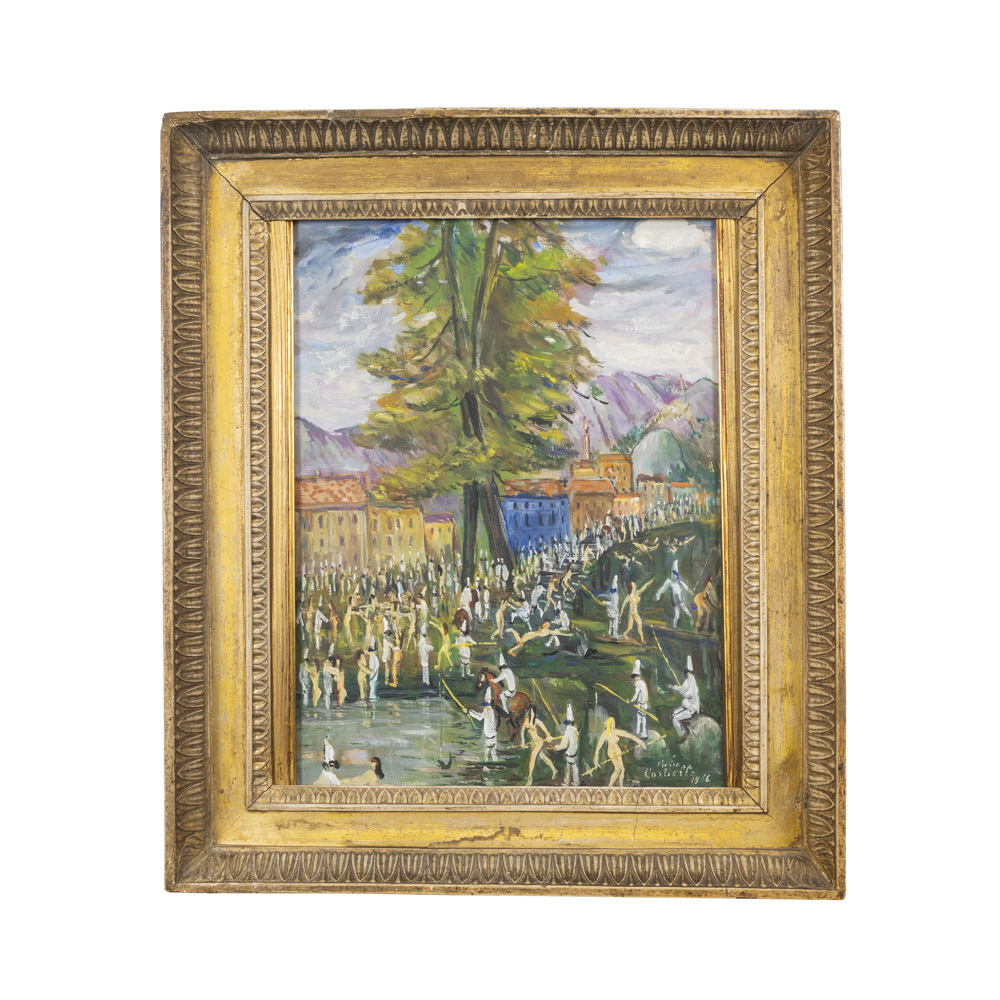 "Il weekend di Pulcinella", 1967, olio su masonite, firmato e datato in basso a destra, entro cornice