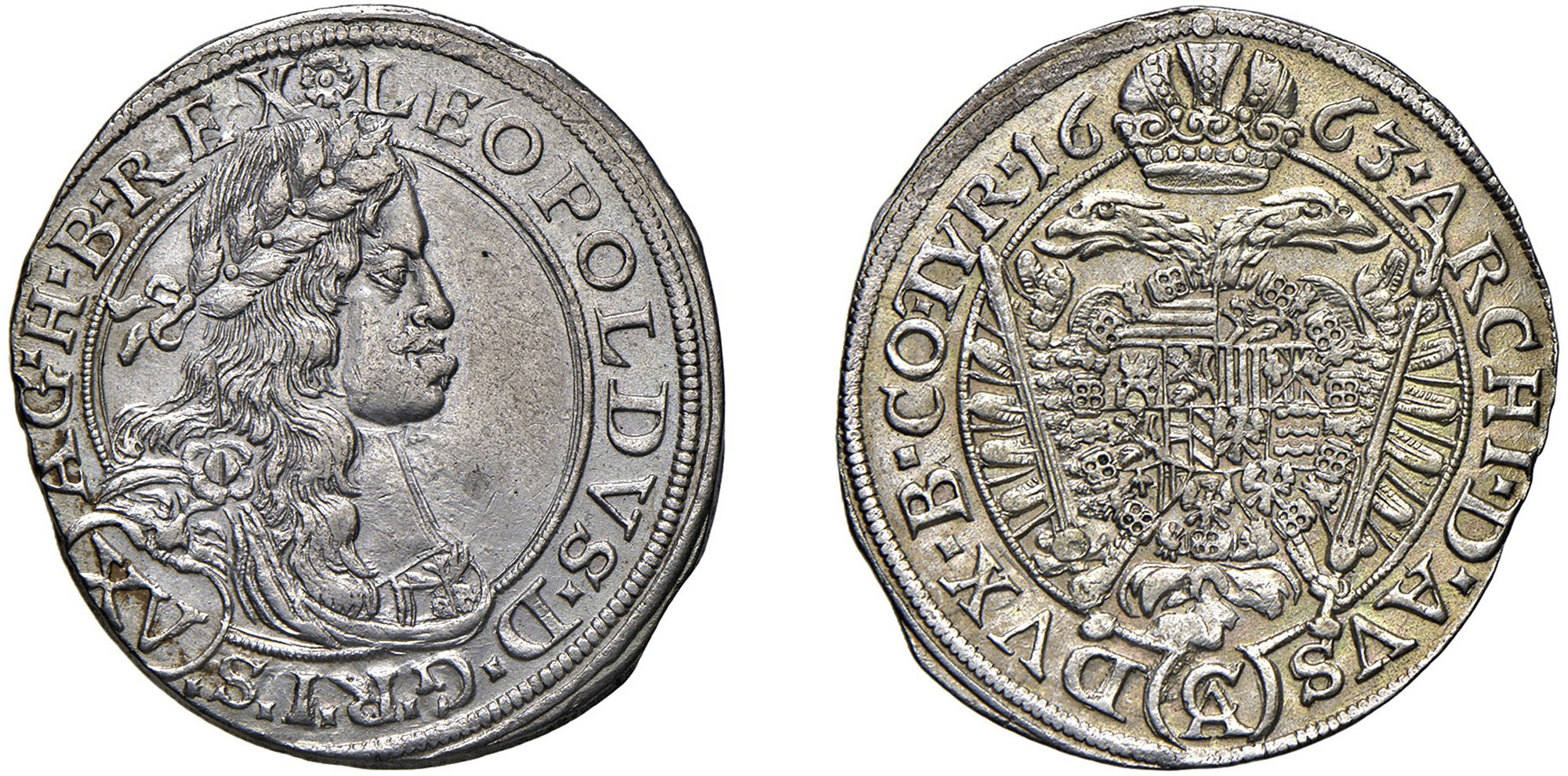 AUSTRIA - LEOPOLDO I (1657-1705) - 15 Kreuzer 1663, Vienna.Argento - 5,69 gr.Dritto: Busto laureato, corazzato e drappeggiato, a destra; - Rovescio: Aquila bicipite coronata con scudo caricato in petto.KM# 1198Esemplare decentrato.m.BB