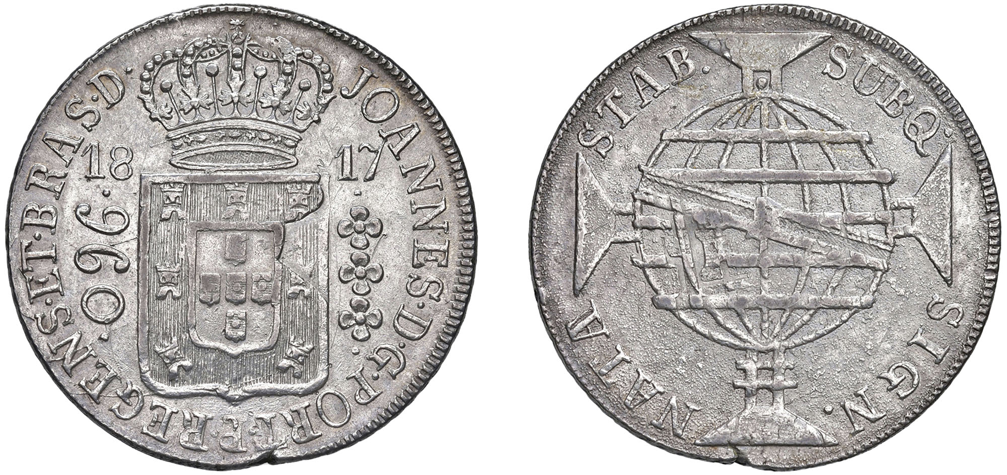 BRASILE - JOAO VI (1816-1826) - 960 Reis 1817, Bahia.Argento - 26,80 gr.Dritto: Stemma reale coronato; - Rovescio: Globo con fascia centrale su croce.KM# 307.3Mancanza al bordo e fondi 'porosi' al /R. Tracce di ribattitura su altra moneta.BB