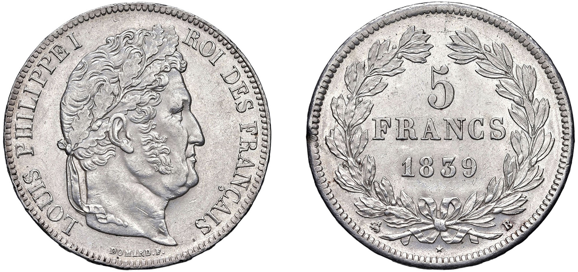 FRANCIA - LUIGI FILIPPO D'ORLEANS (1830-1848) - 5 Franchi 1839 B, Rouen.Argento - 24,99 gr.Dritto: Testa a destra con corona di lauro; - Rovescio: Valore tra due rami di lauro.KM# 749.2Lieve difetto di conio al bordo, ma esemplare di ottima qualità.m.SPL