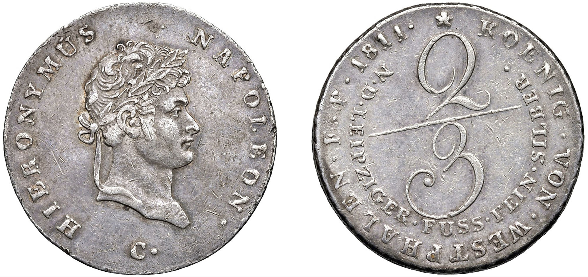 GERMANIA - WESTFALIA - GERONIMO NAPOLEONE (1807-1813) - 2/3 Thaler 1811.Argento - 13,00 gr.Dritto: Testa laureata a destra; - Rovescio: Valore.KM# 117 Rarom.BB/q. SPL