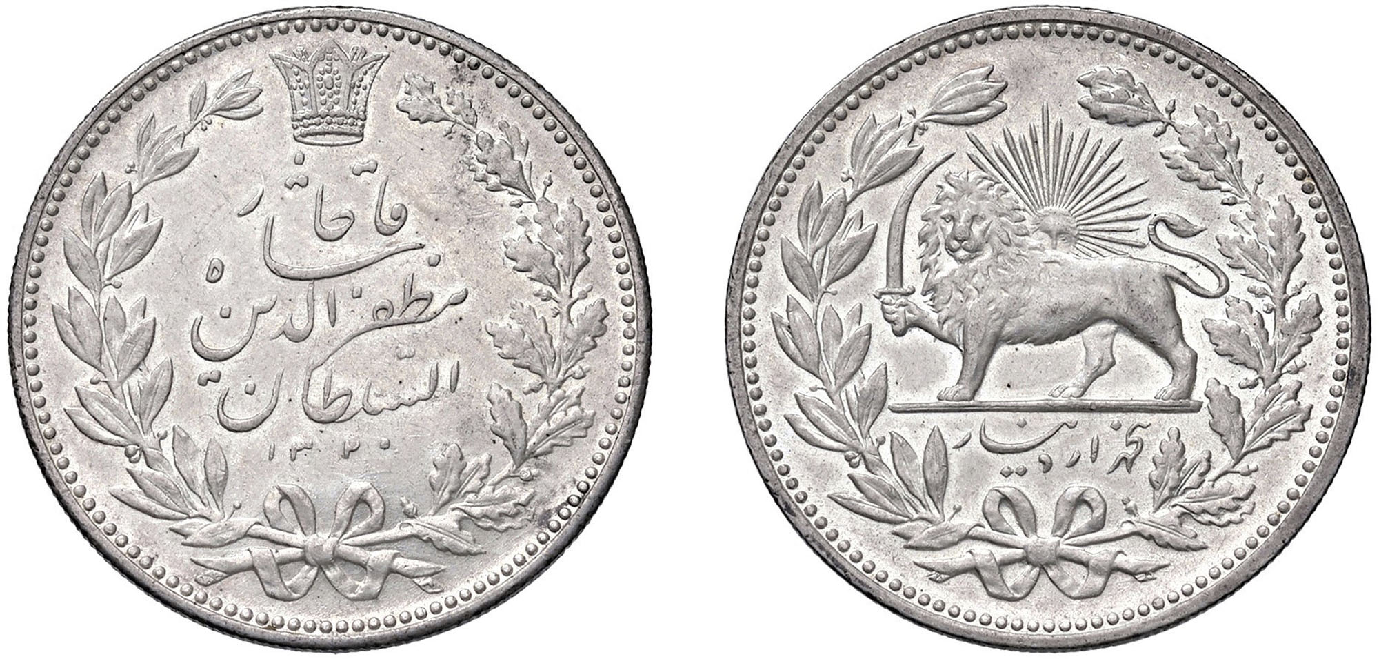 IRAN - MUZAFFAR AL-DIN SHAH (1896-1907) - 5000 dinars 1902.Argento - 23,00 gr.Dritto: Iscrizione, sormontata da corona, tra rami di alloro e quercia; - Rovescio: Leone verso sinistra, con spada; sullo sfondo, sole raggiante, tutto entro corona di alloro e quercia.KM# 976Bell'esemplare dal lustro integro.q.FDC
