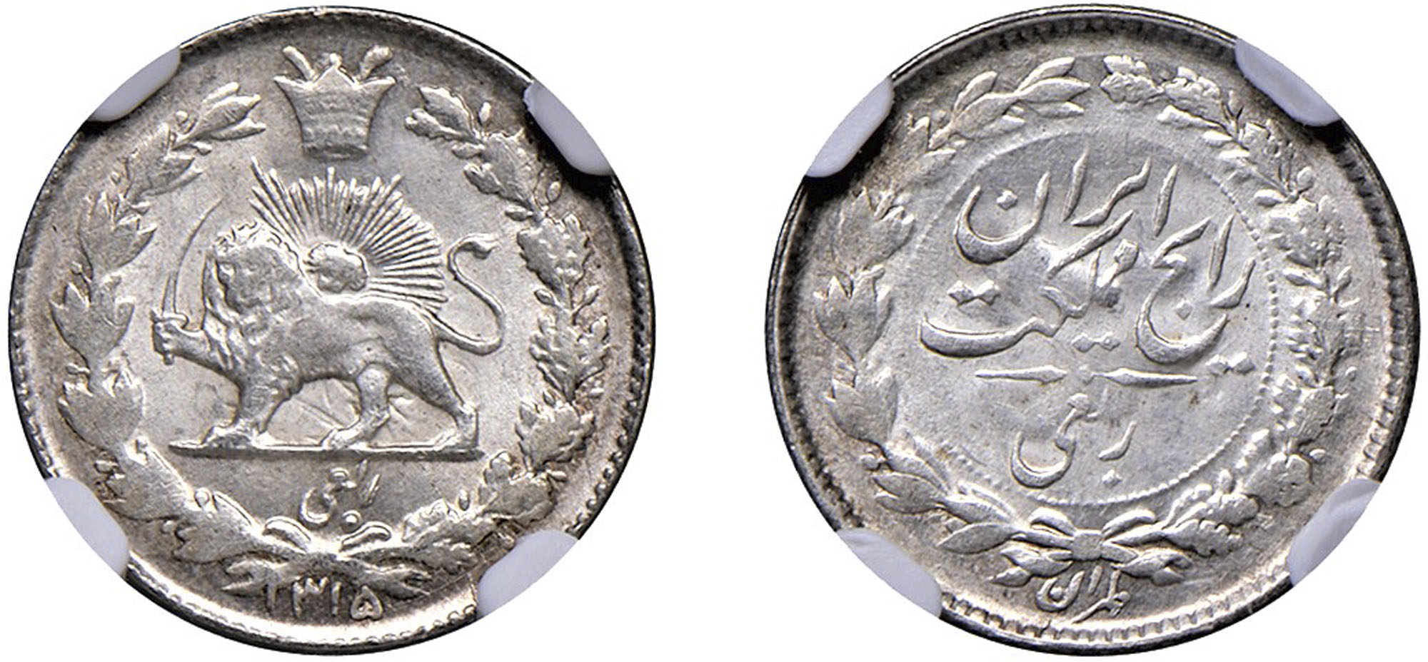 IRAN - REZA SHAH (1925-1941) - 1/4 kran.Argento - n.d.Dritto: Iscrizione entro rami; - Rovescio: Leone verso sinistra, con spada; sullo sfondo, sole raggiante, tutto entro corona di alloro e quercia.KM# 1093Usuale debolezza di conio, ma esemplare di grande freschezza e conservazione.Sigillato NGC MS64Certificato NGC n. 6408735-020
