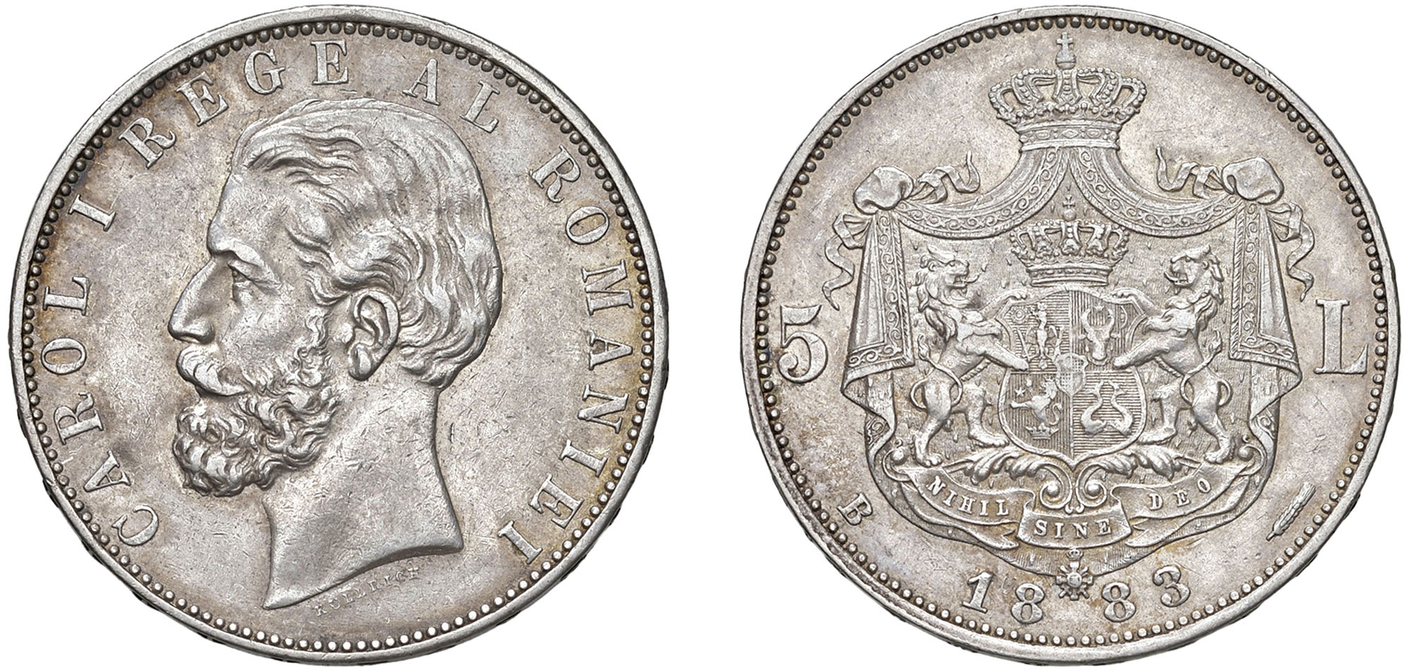 ROMANIA - CAROL I (1881-1914) - 5 Lei 1883.Argento - 25,01 gr.Dritto: Testa barbuta a sinistra; - Rovescio: Scudo coronato.KM# 17.1Buon esemplare per questa tipologia di difficile reperibilità in alta conservazione.m.BB/q.SPL
