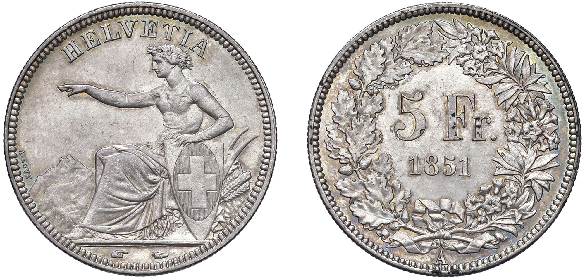 SVIZZERA - CONFEDERAZIONE ELVETICA (1848-) - 5 franchi 1851, Parigi.Argento - 24,99 gr.Dritto: L'Elvezia seduta verso sinistra; - Rovescio: Valore e data entro corona.KM# 11Impercettibili graffietti su lustro di conio. Principio di patina iridescente.m.SPL
