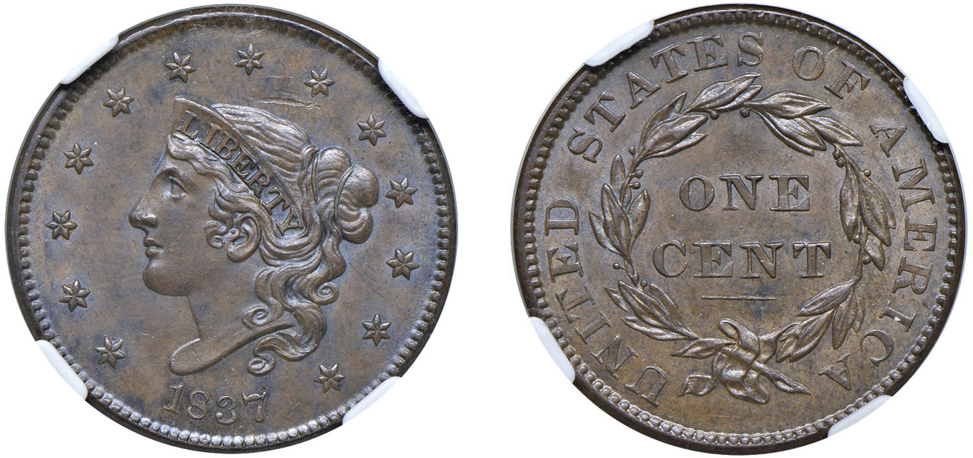 STATI UNITI D'AMERICA - 1 centesimo 1837.Rame - 11,00 gr.Dritto: Testa laureata a sinistra; - Rovescio: Iscrizione entro corona di lauro.KM# 45.2Sigillato CCG MS63Certificato CCG n. AA546337
