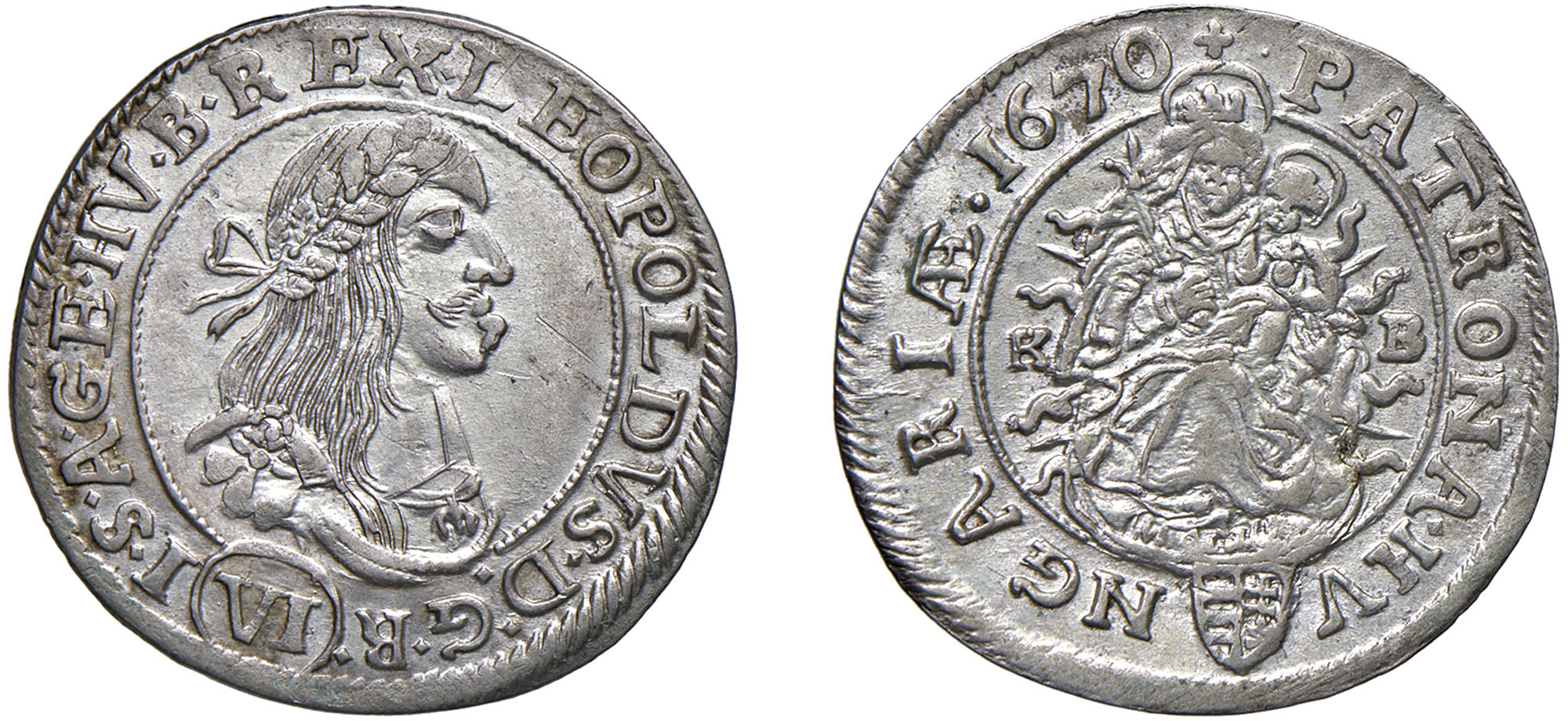UNGHERIA - LEOPOLDO I (1657-1705) - 6 Kreuzer 1670, Kremnitz.Argento - 3,27 gr.Dritto: Busto laureato, corazzato e drappeggiato, a destra; - Rovescio: Madonna coronata con bambino.KM# 164Usuali debolezze di conio e lieve graffietto al /D, ma esemplare di ottima freschezza.q.SPL