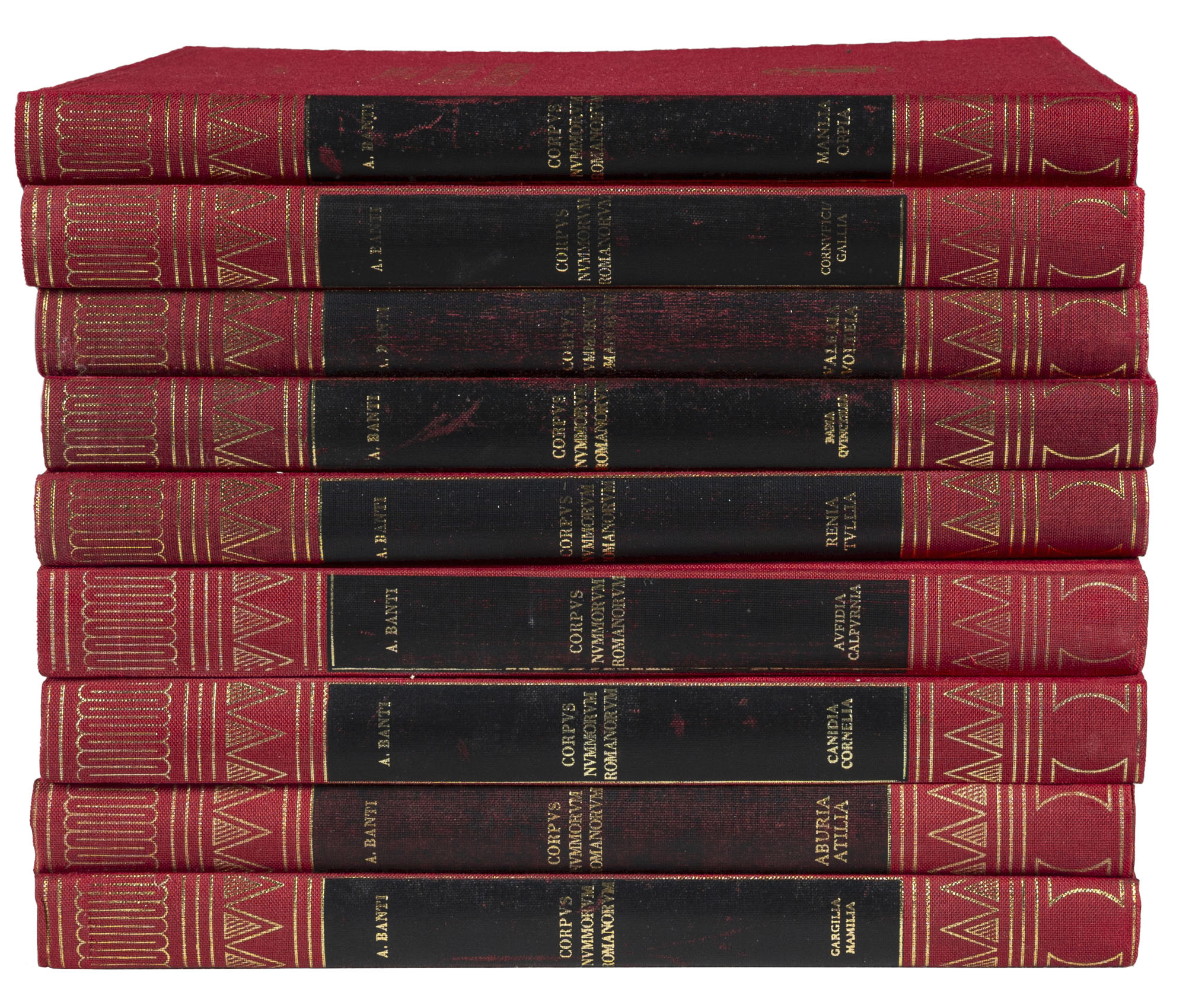 BANTI ALBERTO - Corpus Nummorum Romanorum (9 volumi).Monetazione repubblicana. Serie completa. Voll. I-IX (Aburia-Volteia).Banti editore, Firenze, 1980-1982. In-4, Tela editoriale con decorazioni e titoli dorati al dorso e al piatto anteriore.In buono stato generale.Importante opera per lo studio delle monete repubblicane romane.