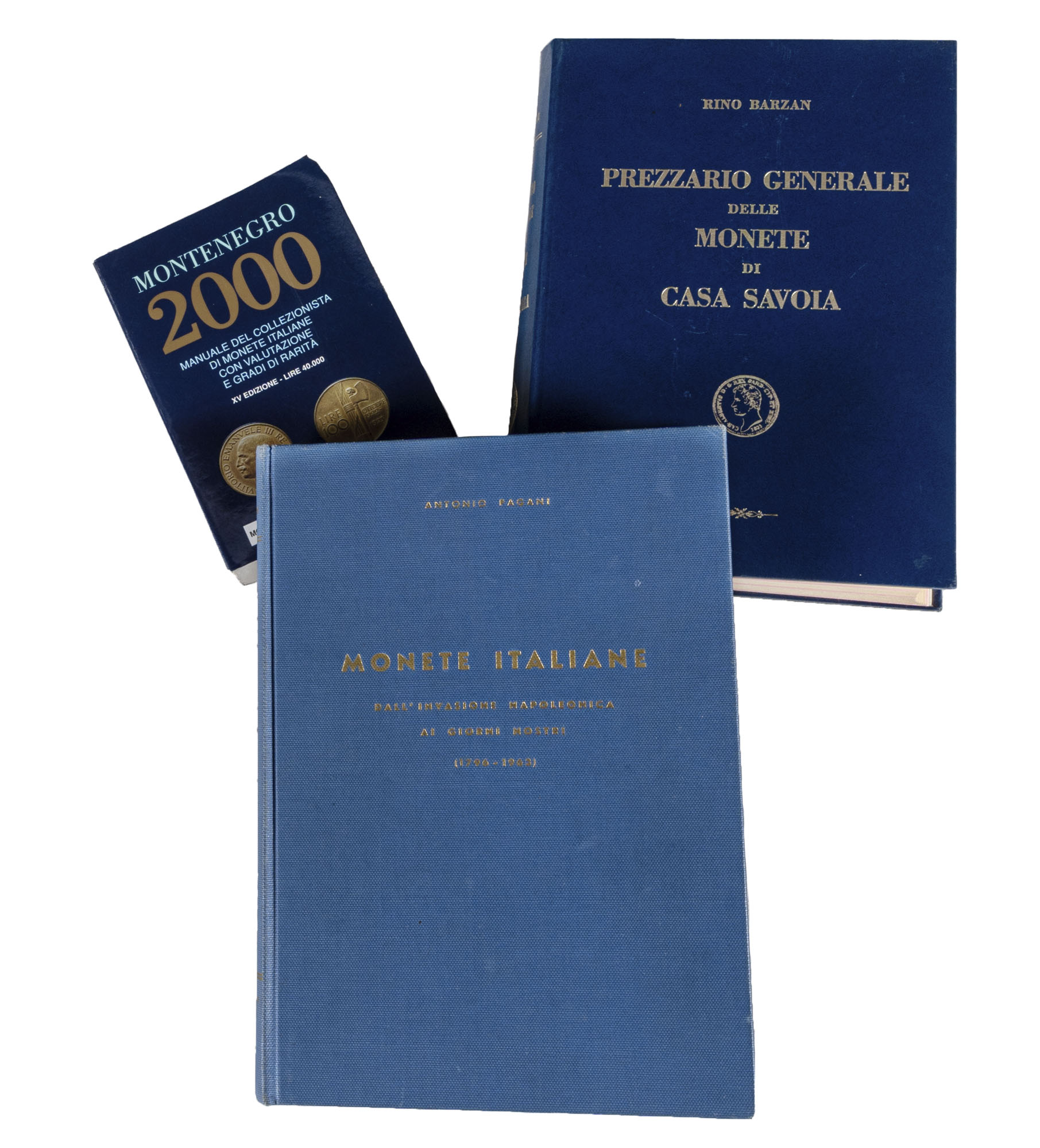 AA. VV. - Lotto di tre cataloghi/prezziari.- PAGANI ANTONIO - Monete italiane dall'invasione napoleonica ai giorni nostri (1796-1963).II edizione riveduta e corretta, Mario Ratto editore, Milano, 1965, 381 pp., con illustrazioni b/n. Tela editoriale con titoli in oro al dorso e al piatto anteriore.In buono stato.- BARZAN RINO - Prezziario Generale delle monete di Casa Savoia.Editore Luigi Simonetti, Firenze 1970. pp. 310.Legatura in tutta pelle editoriale blu, con titoli e decorazioni in oro al dorso e ai piatti.In ottimo stato.- MONTENEGRO - Manuale del collezionista di monete italiane dal '700 ad oggi.Edizioni numismatiche Montenegro, Torino, 2000. pp. 814. Brossura editoriale.In ottimo stato.
