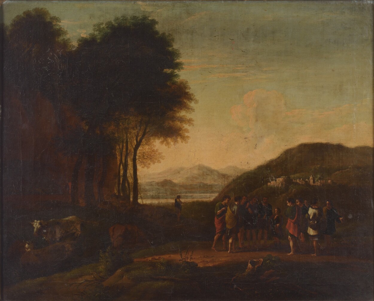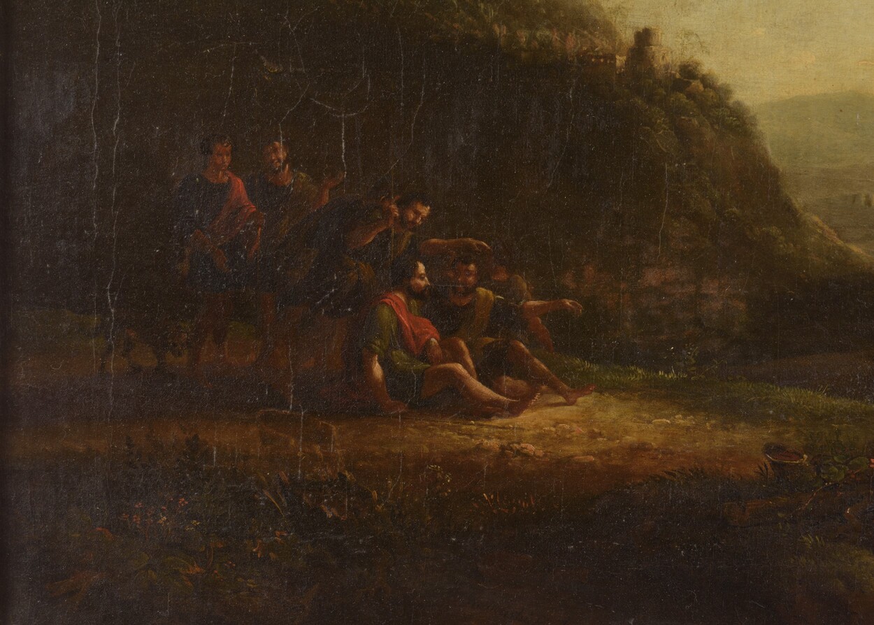 Maximilian Neustück (1756 - 1834) Coppia di paesaggi con personaggi 1795 Olio su tela 54 x 67 cm