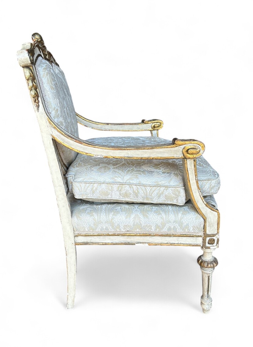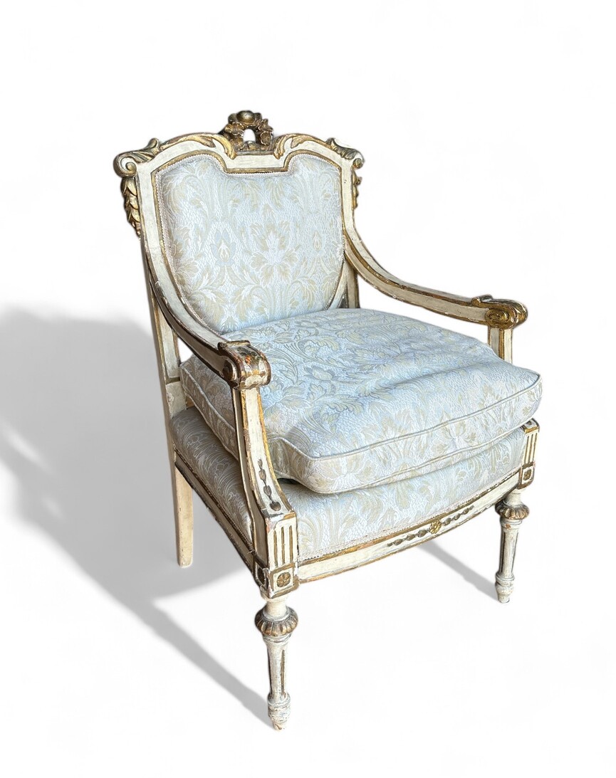 Composto da: 8 sedie e due capotavola con i braccioli (dimensioni: 98 x 66 x 56 cm). In legno laccato.