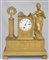 In bronzo dorato e cesellato. Con figura femminile poggiante su corpo centrale. Quadrante in smalto bianco a numeri romani. Movimento a filo con suoneria a ore e mezz'ore. Mancanze.
