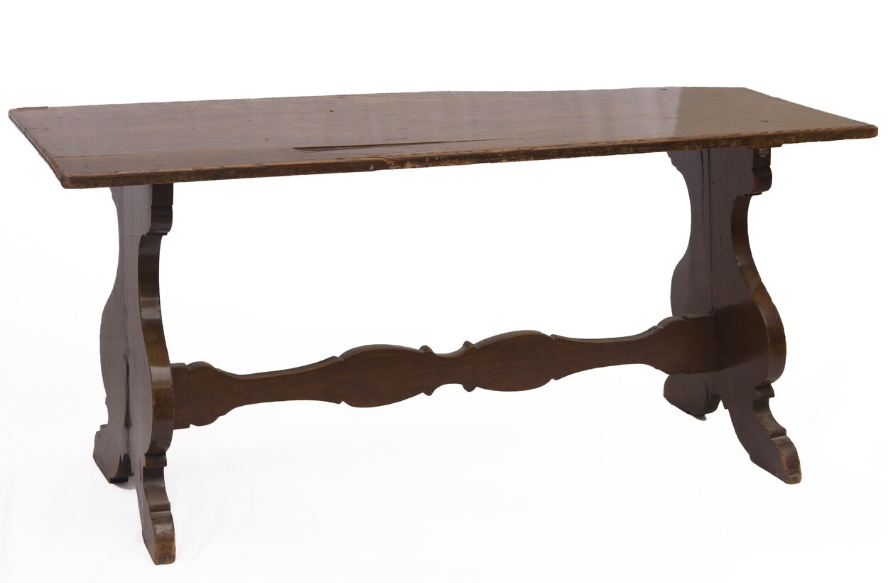 In legno di noce con basamento a lira, raccordato da crociera. Antica manifattura, Italia centrale. Rotture e mancanze.