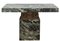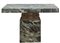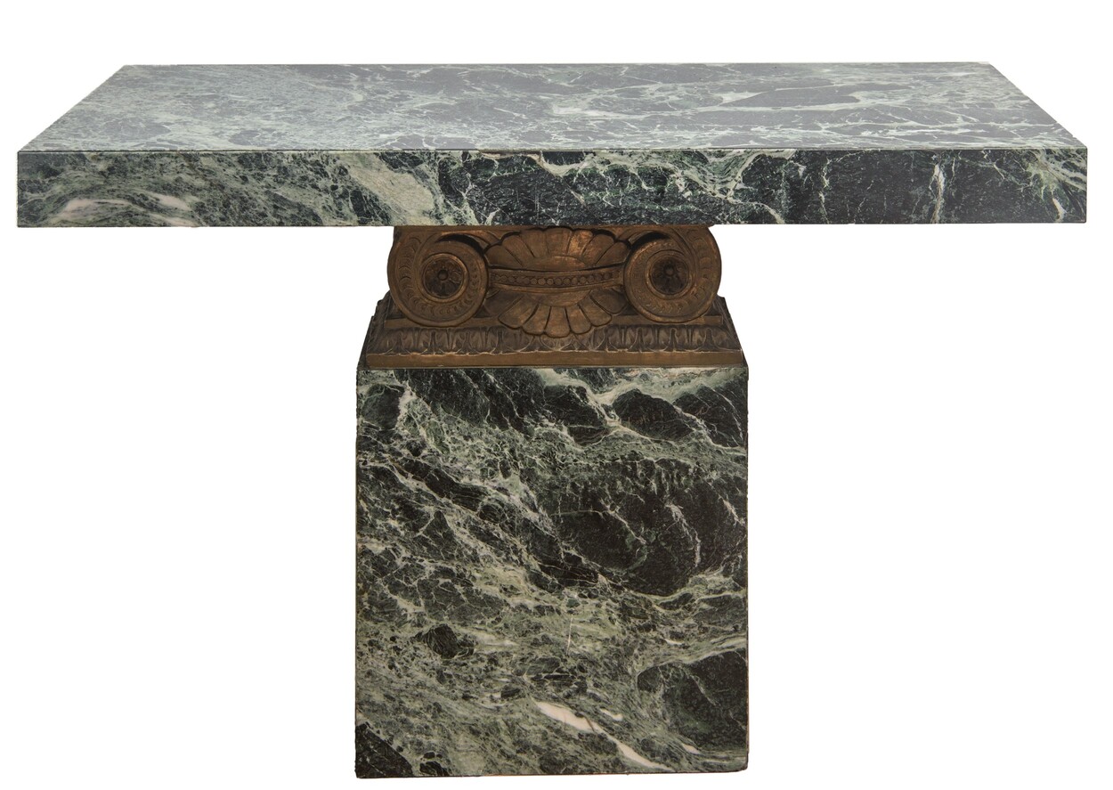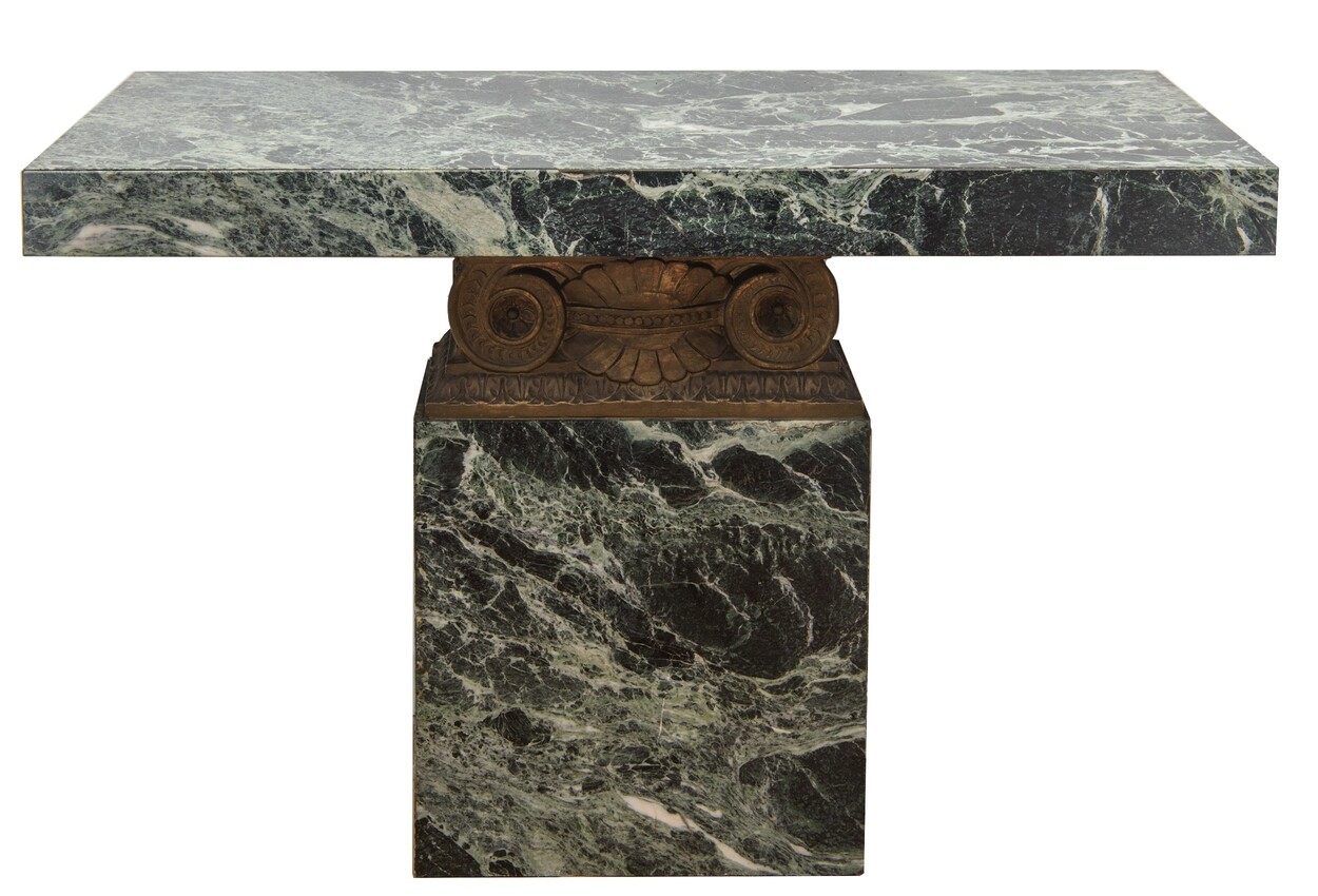In marmo verde delle Alpi lastricato su travertino con piano di forma rettangolare sorretto da capitello stilizzato in gesso a patina dorata poggiante su ampio basamento. Manifattura italiana.