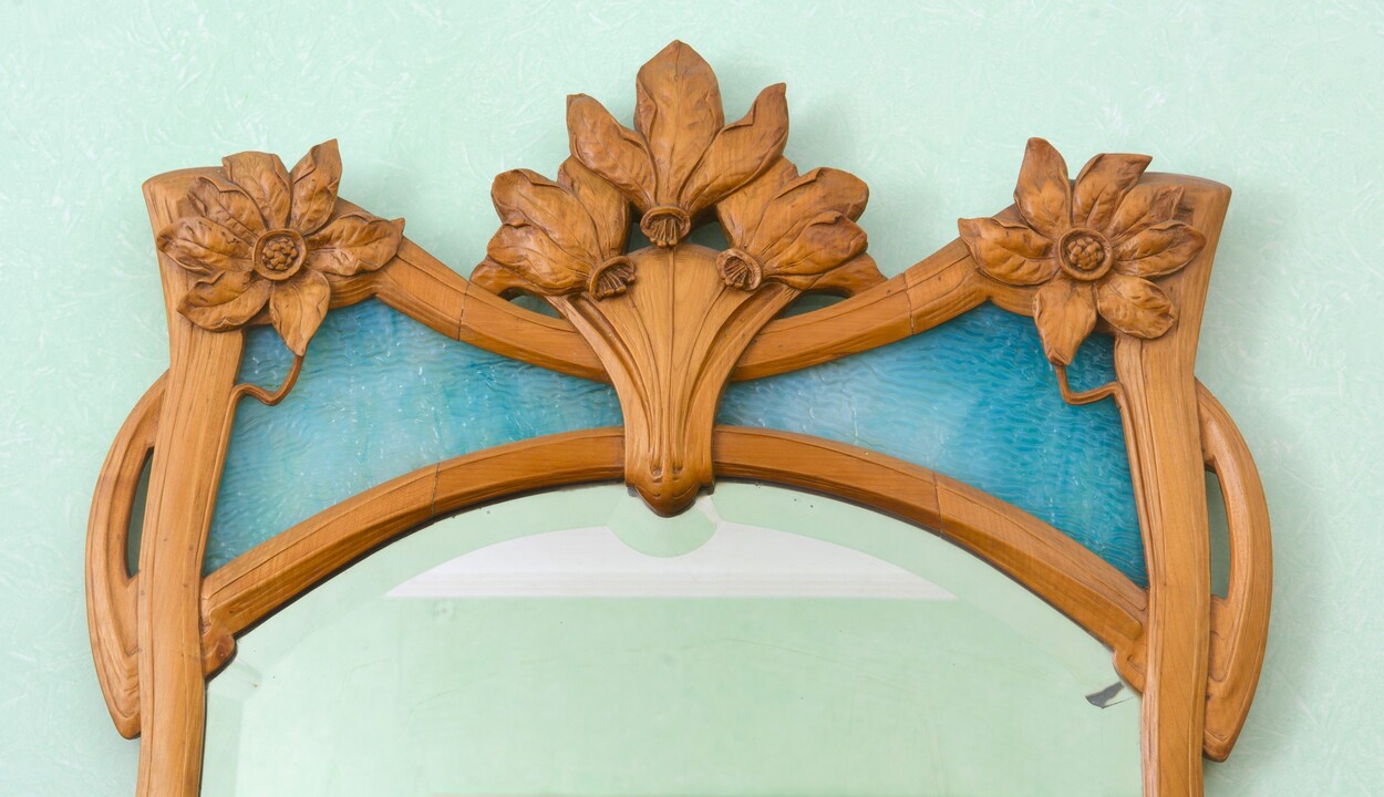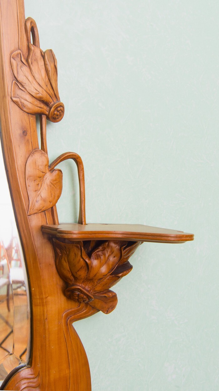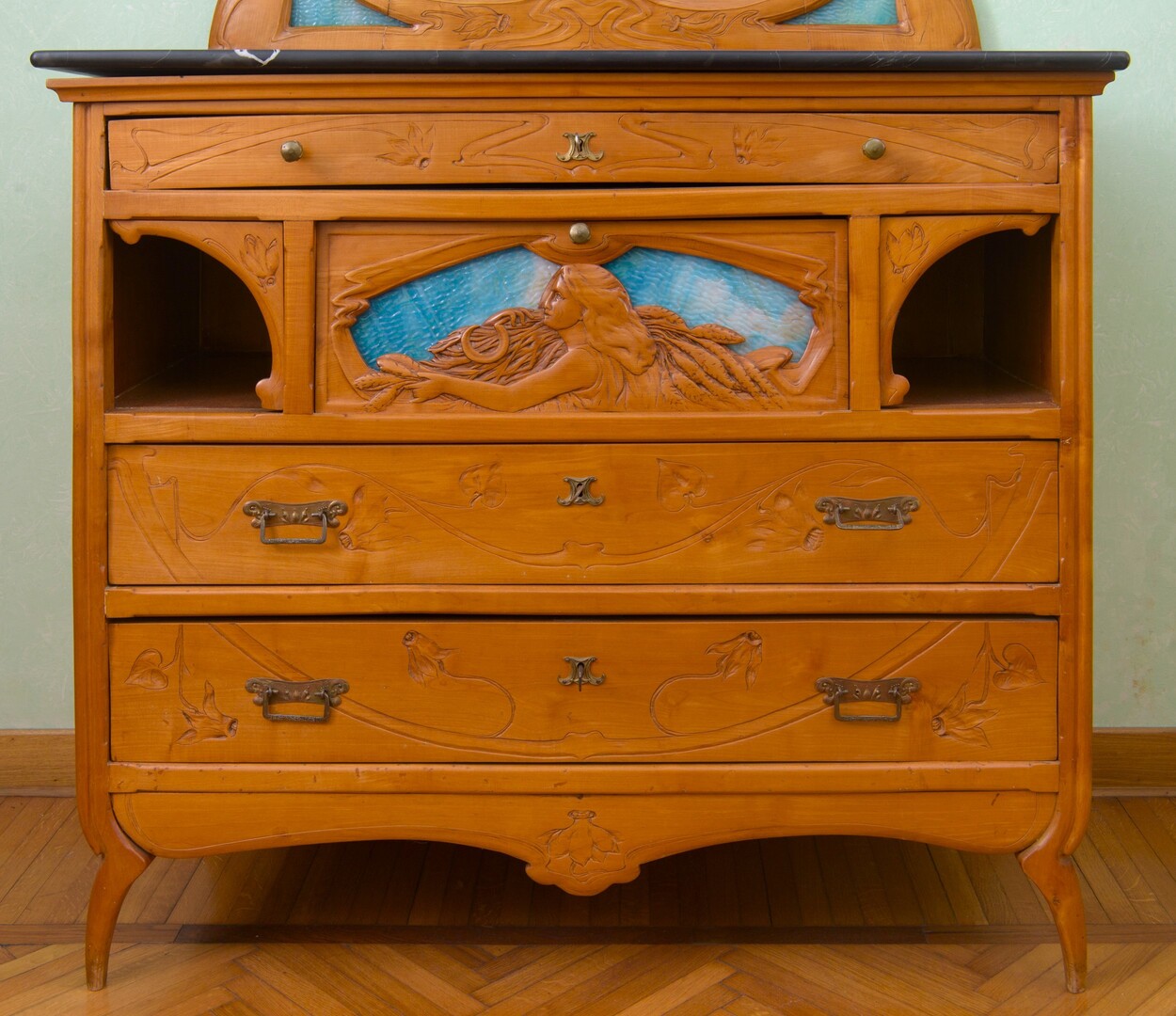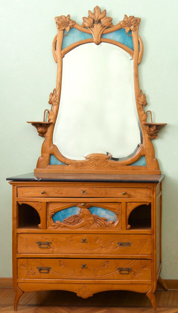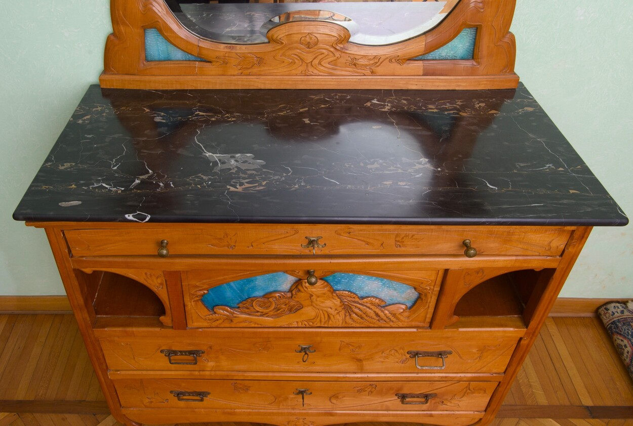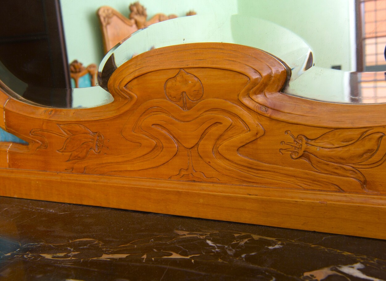 Cassettiera a tre cassetti, calzatoia centrale e ripiani laterali con alzata a specchio e coppia di mensole laterali. In legno di acero con inserti scolpiti a decorazioni floreali; marmo portoro e inserti in pasta vitrea color celeste. Dimensioni cassettiera: 106 x 120 x 65 cm; dimensioni specchiera 143 x 121 cm.