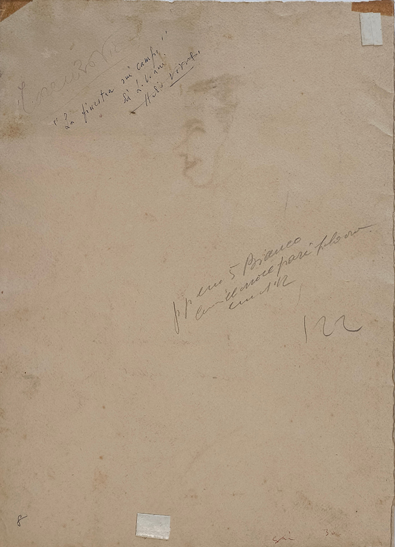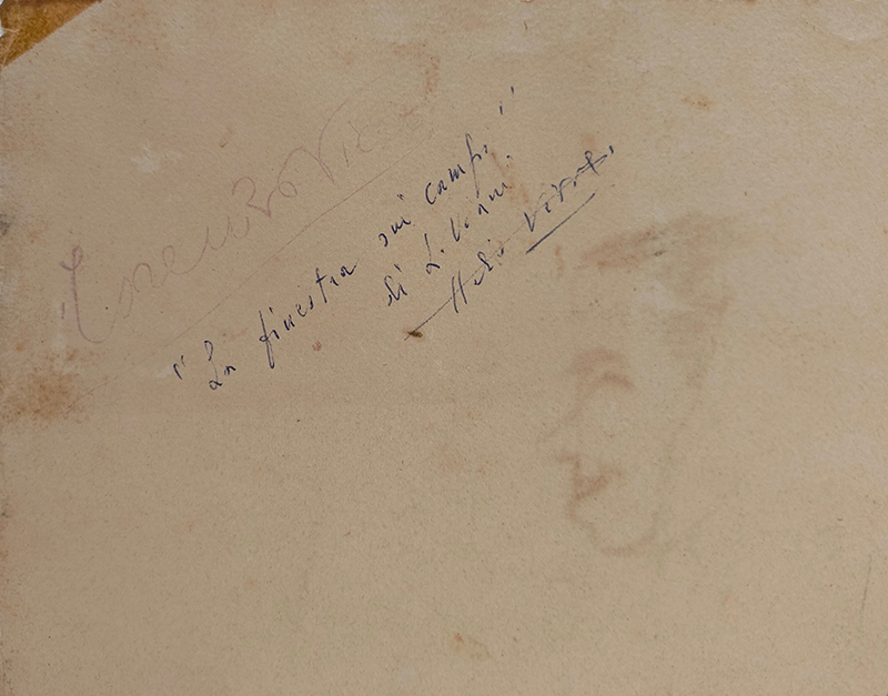 Firmato fronte opera Al verso firma stampigliata controfirmata per autentica da Amelio Vivaldi genero dell’artista, con dicitura a penna: ‘La finestra sui campi’ di L. Viani”.- Provenienza collezione privata Pietrasanta