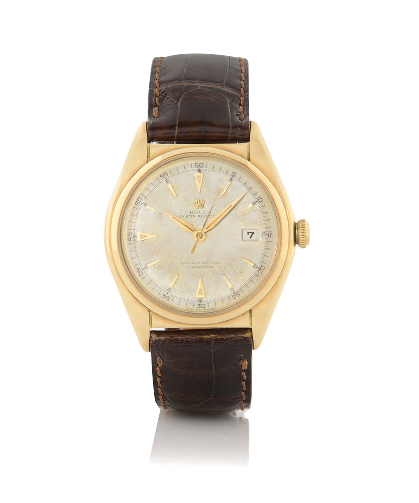 C. 18K yellow gold with screwed case back and crown. D. silvered with applied indexes, centre seconds and date at 3. M. self-winding. Dial, case and movement signed. Accompanied by Rolex strap and buckle.