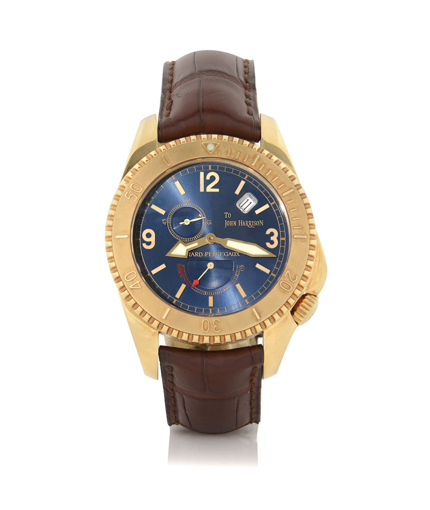 C. solid, 18K yellow gold with case back secured by screws, crown at 4, graduated and revolving bezel, sapphire crystal. D. blue with applied indexes and Arabic numerals, luminous hands, seconds between 10 and 11, power reserve at 6 and date between 1 and 2. M. self-winding. Dial, case and movement signed. Accompanied by Girard Perregaux strap, 18K yellow gold deployant clasp, box and certificate dated 05/2006.