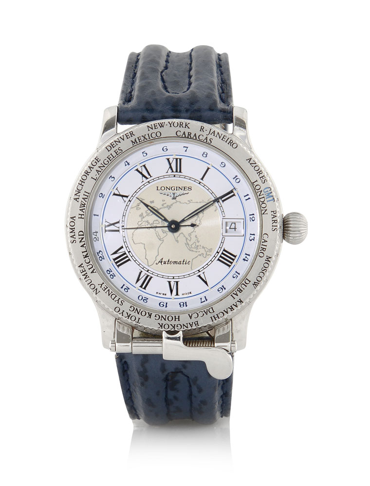 Cassa in acciaio con oblò sul fondello, lunetta girevole con smaltate le principali città del mondo, fermo a leva al 6. Quadrante bianco e argentato con numeri romani smaltati, 24 ore periferiche, secondi al centro e data al 3. Movimento a carica automatica. Quadrante, cassa e movimento firmati. Completo di astuccio in legno numerato con scultura in vetro e certificato originali.