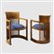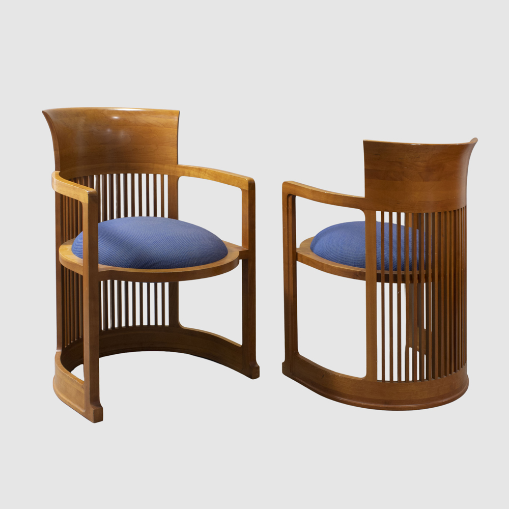 Frank Lloyd Wright, prod. Cassina (2)Italia, anni 8080x55x50 cm.coppia di poltrone mod. Barrel in legno e tessuto imbottito, marchio della produzione