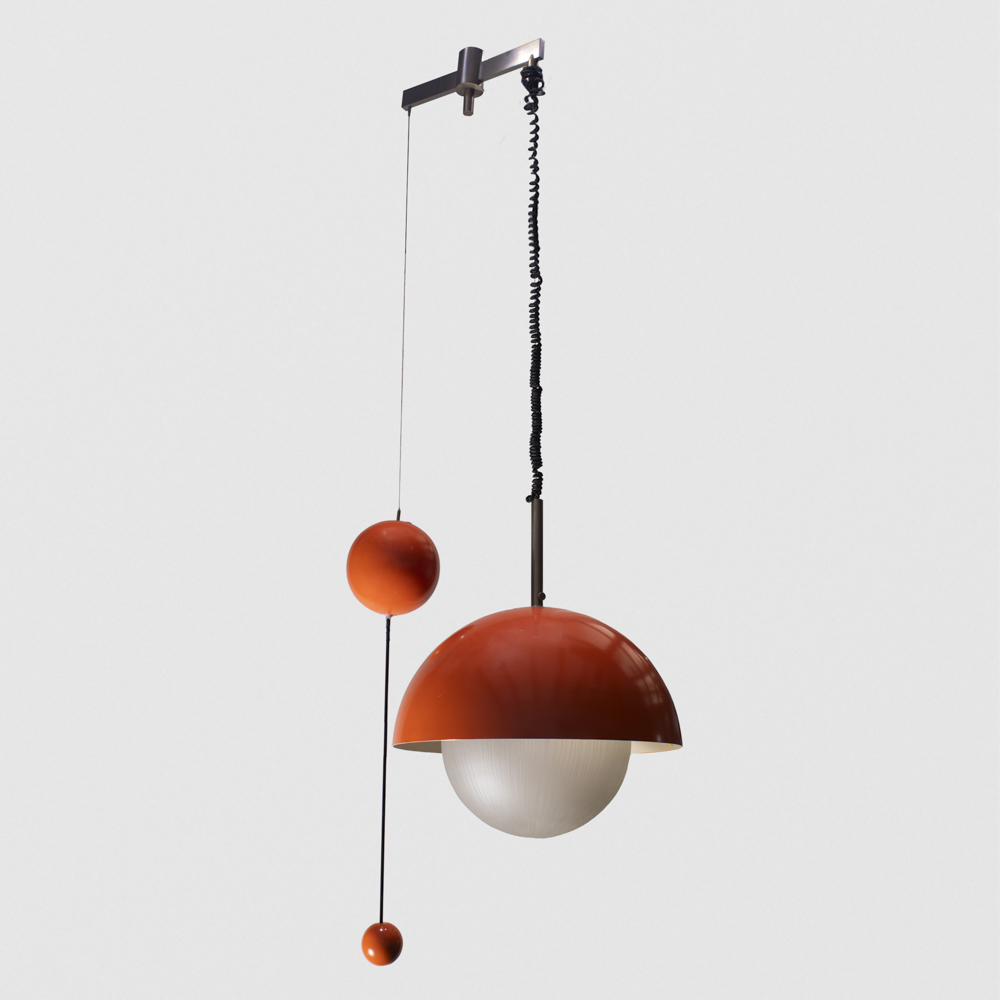 Angelo Lelii, prod. ArredoluceItalia, 1962 circah. 170 cm.lampada a sospensione mod. 12963 in ottone, alluminio laccato e vetro satinato, usure e difetti.