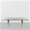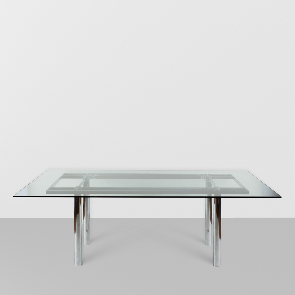 Afra e Tobia Scarpa, prod. GavinaItalia, anni 6070,5x205x115 cm.tavolo mod. Andrè in metallo cromato, pelle e vetro trasparente