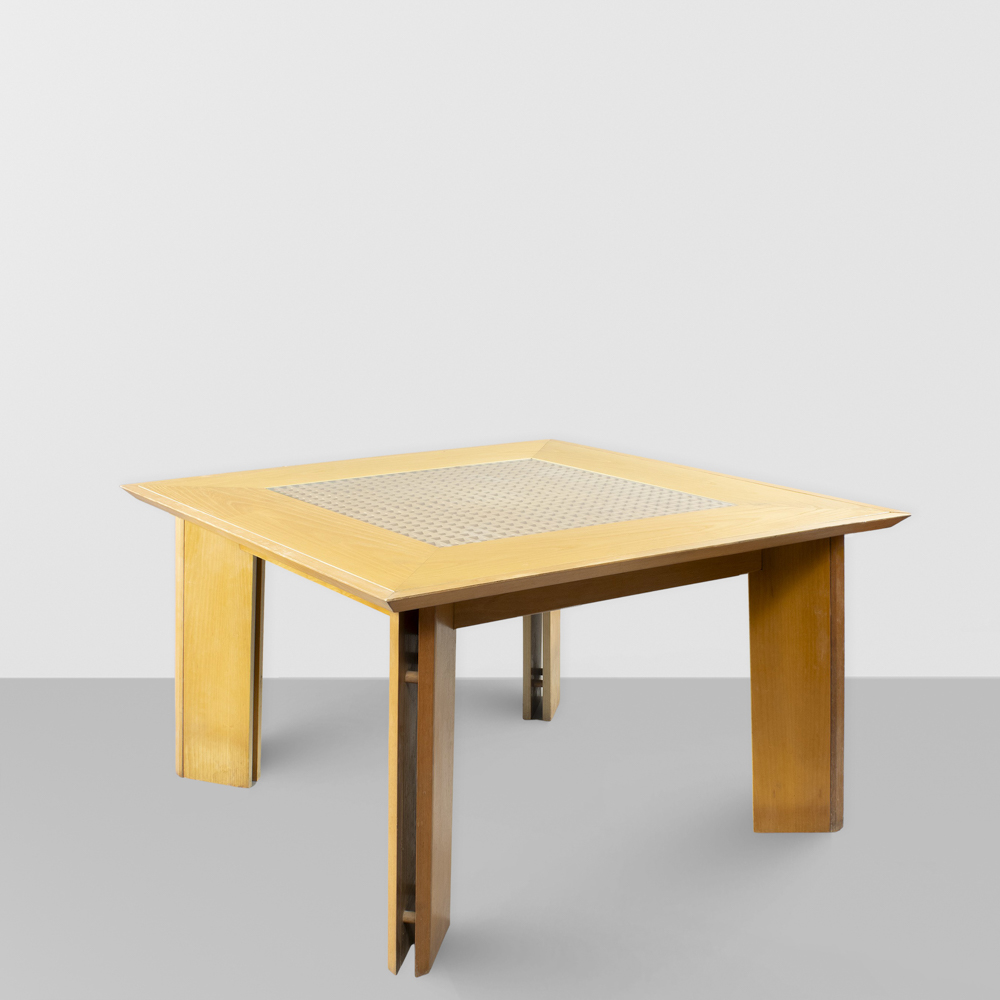 Gigi Sabadin, prod. StilwoodItalia, anni 7070x120x120 cm.tavolo quadrato in legno e vetro trasparente, usure