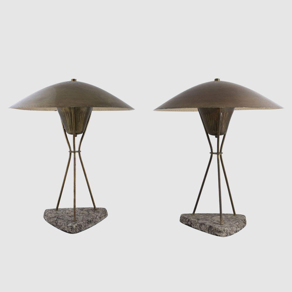 Manifattura italiana (2)anni 5050x43 cm.coppia di lampade da tavolo in ottone, metallo verniciato e base in granito, lievi usure