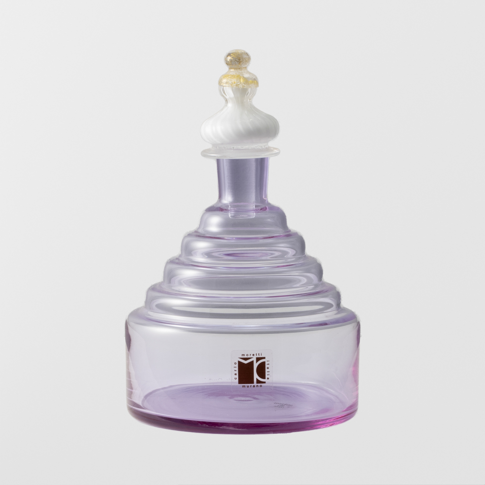 Carlo MorettiMurano, anni 70-8021x13 cm.bottiglia in vetro soffiato colorato, vetro lattimo e foglia d'oro, etichette della produzione
