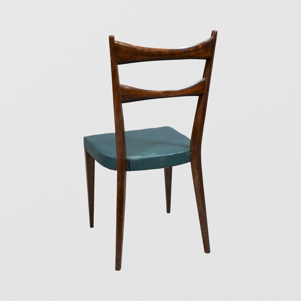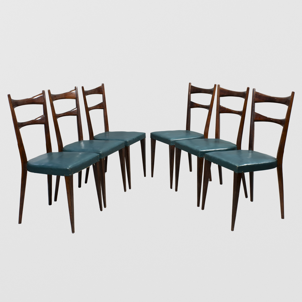 Gio Ponti, attribuito (6)Italia, anni 5093x44x42,5 cm.sei sedie in legno e vinilpelle imbottita