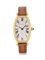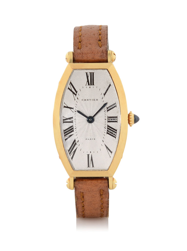 C. tonneau-shaped, 18K yellow gold, case back secured by screws in the band and sapphire set crown. D. soleil silvered with painted Roman numerals. M. manual-winding. Dial, case and movement signed. Accompanied by Cartier strap and buckle.