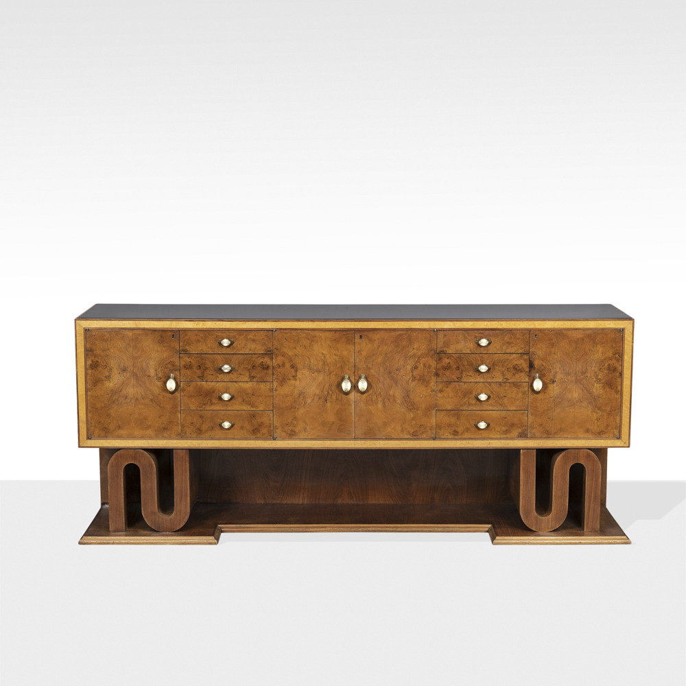 Manifattura italianaanni 30-4098x240x55 cm.credenza in legno e vetro opalino nero, maniglie in osso e metallo dorato, difetti
